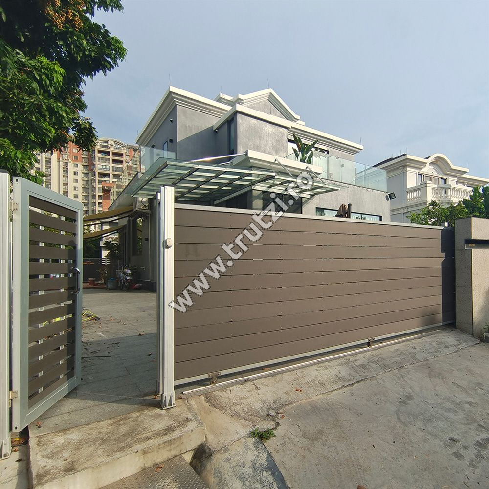 Important: Vă rugăm să aveți în vedere că sistemele de împrejmuire nu pot fi livrate prin serviciul de curierat clasic din cauza volumului și a greutății mari. Ele se livrează prin flota proprie, iar timpul de livrare depinde în funcție de fiecare locație.Poarta culisanta WPC gri inchis PRIVACY 5400X1900MM, stalp 2000MM, rama aluminiu argintie
