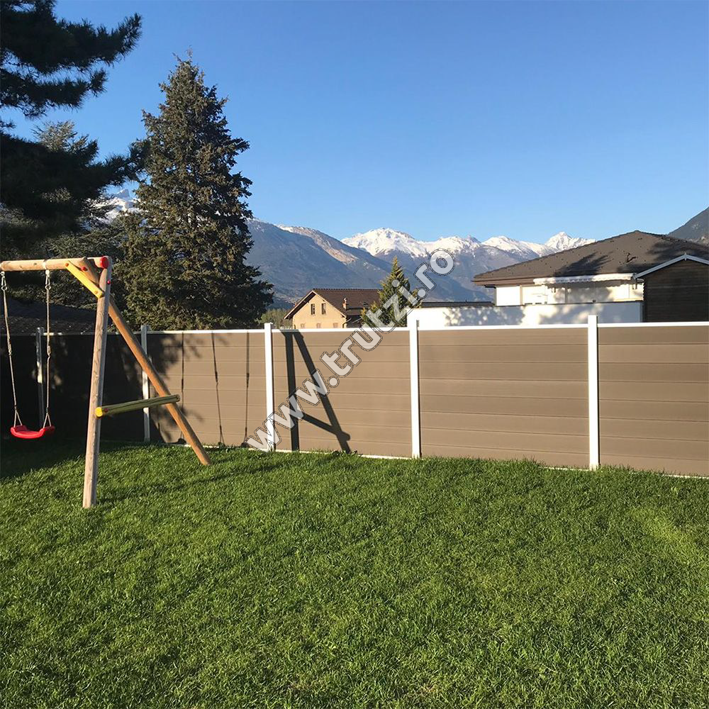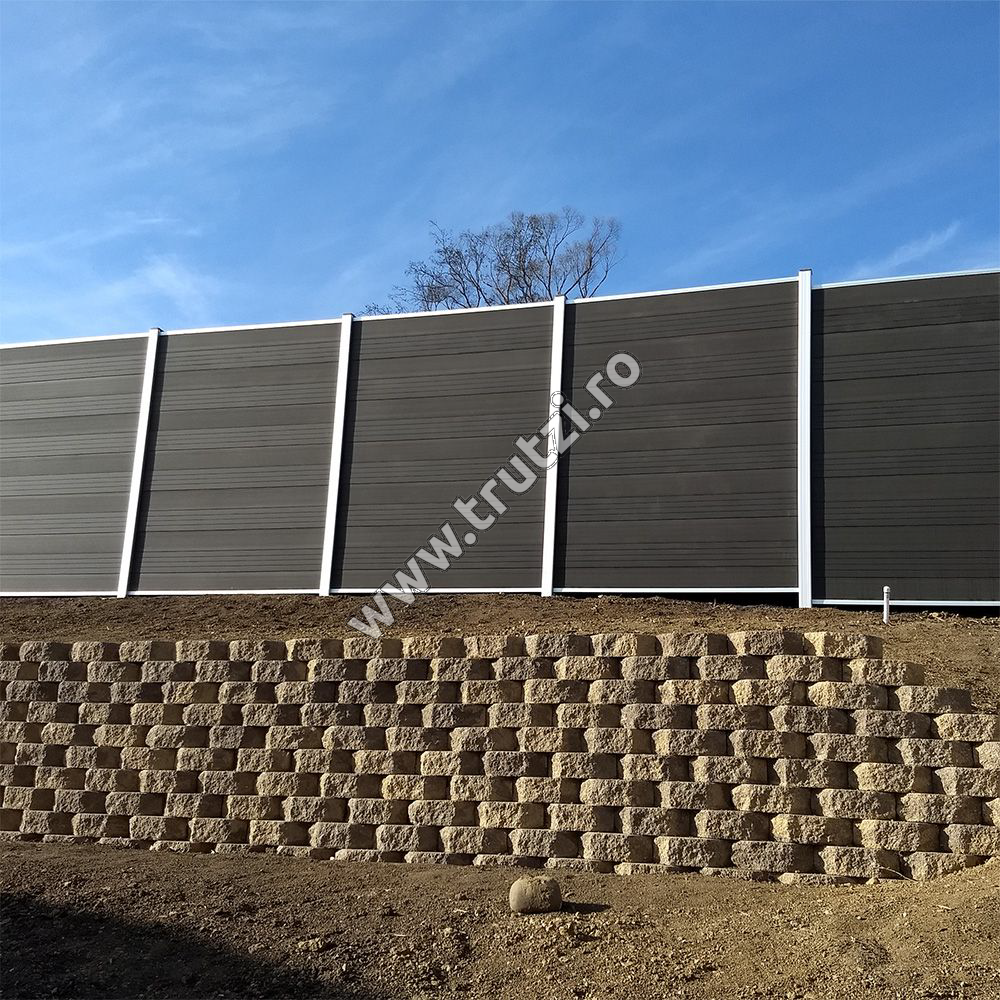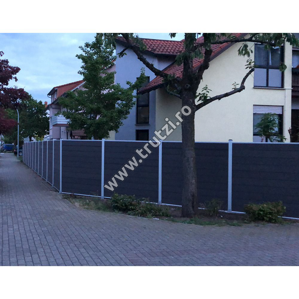 Important: Vă rugăm să aveți în vedere că sistemele de împrejmuire nu pot fi livrate prin serviciul de curierat clasic din cauza volumului și a greutății mari. Ele se livrează prin flota proprie, iar timpul de livrare depinde în funcție de fiecare locație.Kit gard WPC gri inchis PRIVACY 1800X1800MM, stalp 2300MM, rama aluminiu argintie